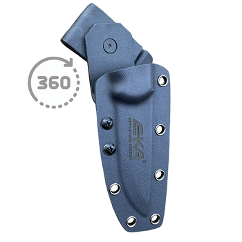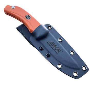 knife that does everything has now become even better. EKA have developed a hunting knife that can handle all activities on your outdoors hunting trip, from sitting and carving, splitting sticks for the fire, to removing and skinning game in all sizes. Disassembly for cleaning is now easy, with a recessed button at the bottom of the handle that is pushed in and down. The scales and the blade then come apart so you can ensure that your knife maintains good hygiene. STEEL IN BLADES: Sandvik 12c27 BLADE LENGTH: 100/80 mm TOTAL LENGTH: 215 mm BLADE THICKNESS: 2.9 mm HANDLE: PROFLEX Grip TOTAL WEIGHT: 135 grams