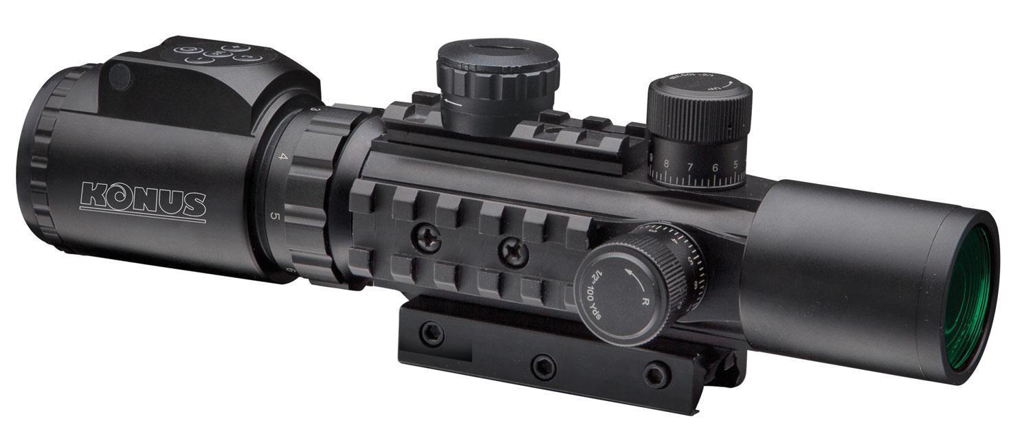 Konuspro AS-34 2-6x28  has been constructed with quick target acquiring properties. Speed and accuracy have therefore been enhanced, wheter at the range or in close quarter combat situations. A beefy outer diameter of 34mm will withstand the most extreme conditions, while an integrated tri-rail system will accpt all of your accessories. Completely waterproof, this model features a dual illuminated Mil-Dot reticle and an illuminated level bubble for low light shooting. The base is reversible and will fit both the Weaver/Picatinny and .22 rails, while the field of view is especially wide for fast moving targets.